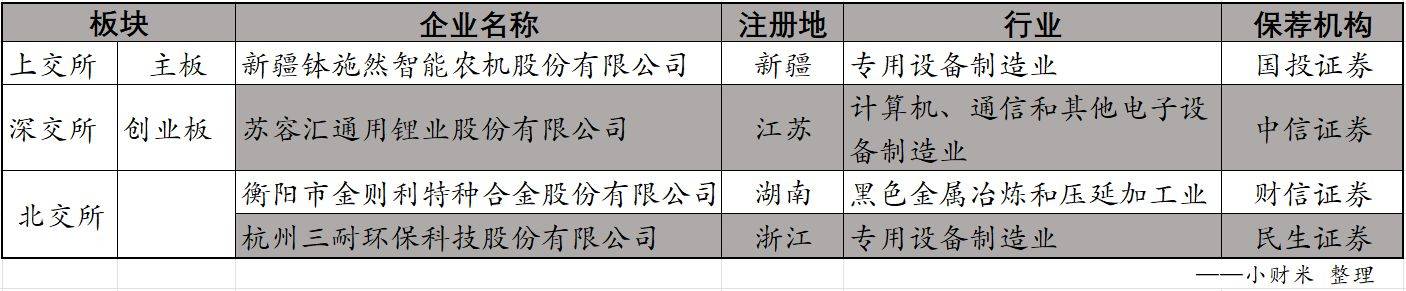 上周(2025年9月15日至9月21日)遵照上海证券往还所、深圳证券往还所、北京证券往还所揭晓的讯息显示,共有四家企业撤回IPO首发申请质料。此中,沪市主板1家,深市创业板1家,北交所2家。